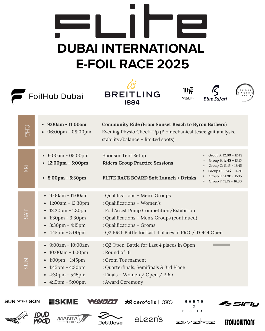 Still TBD but these can include Race Clinics, Community rides, Boat days, Surfing, WakeSurfing, Dune buggies, Go Karting, Fishing, skydiving and so much more that Dubai offers.
